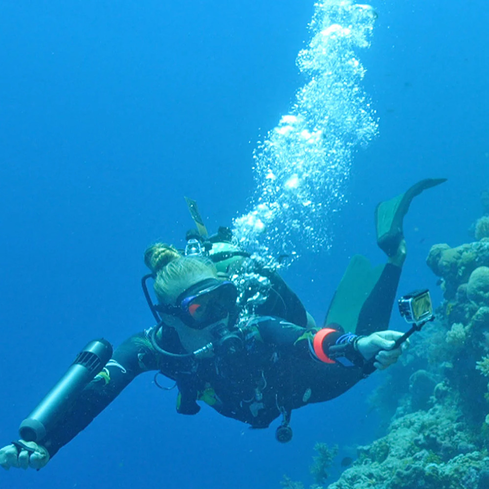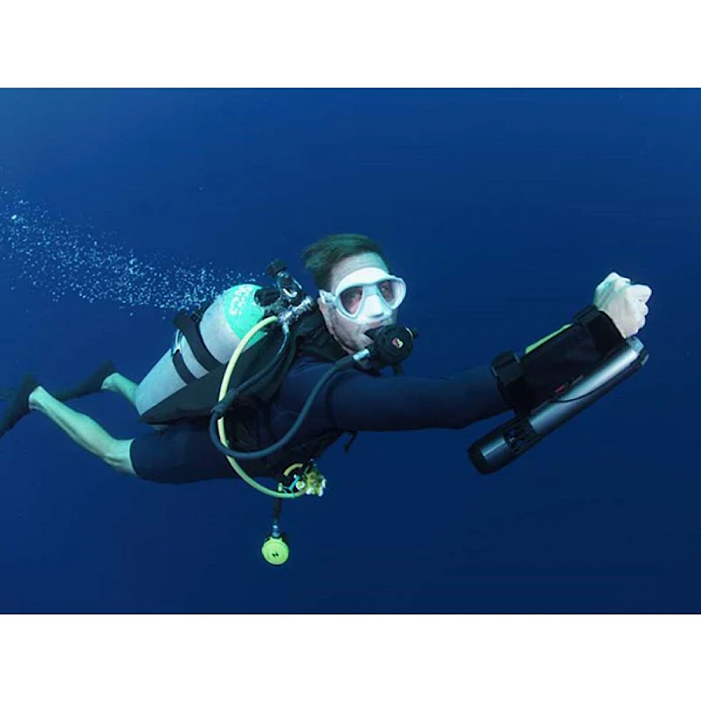 水中では、体やタンクに搭載する事で両手が自由になり、より快適な水中移動を可能にしています。伸縮性のあるケーブルになっているサムコントローラーは、小型で無理のない操作を行うことができます。